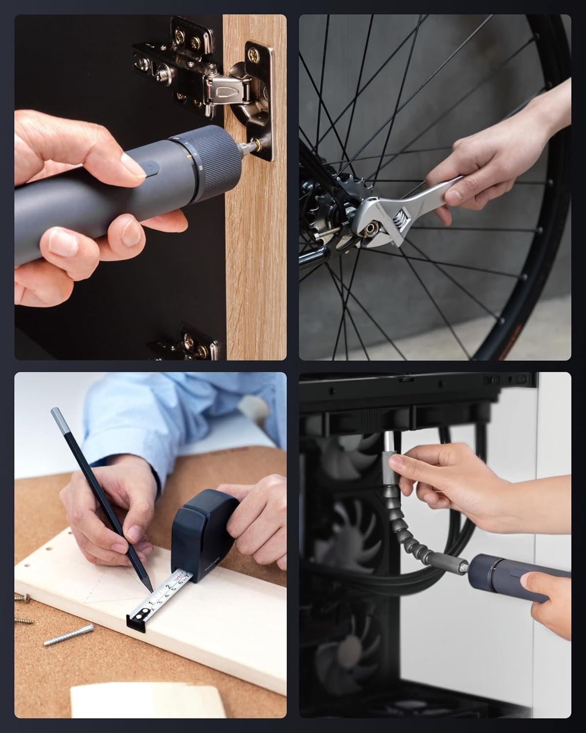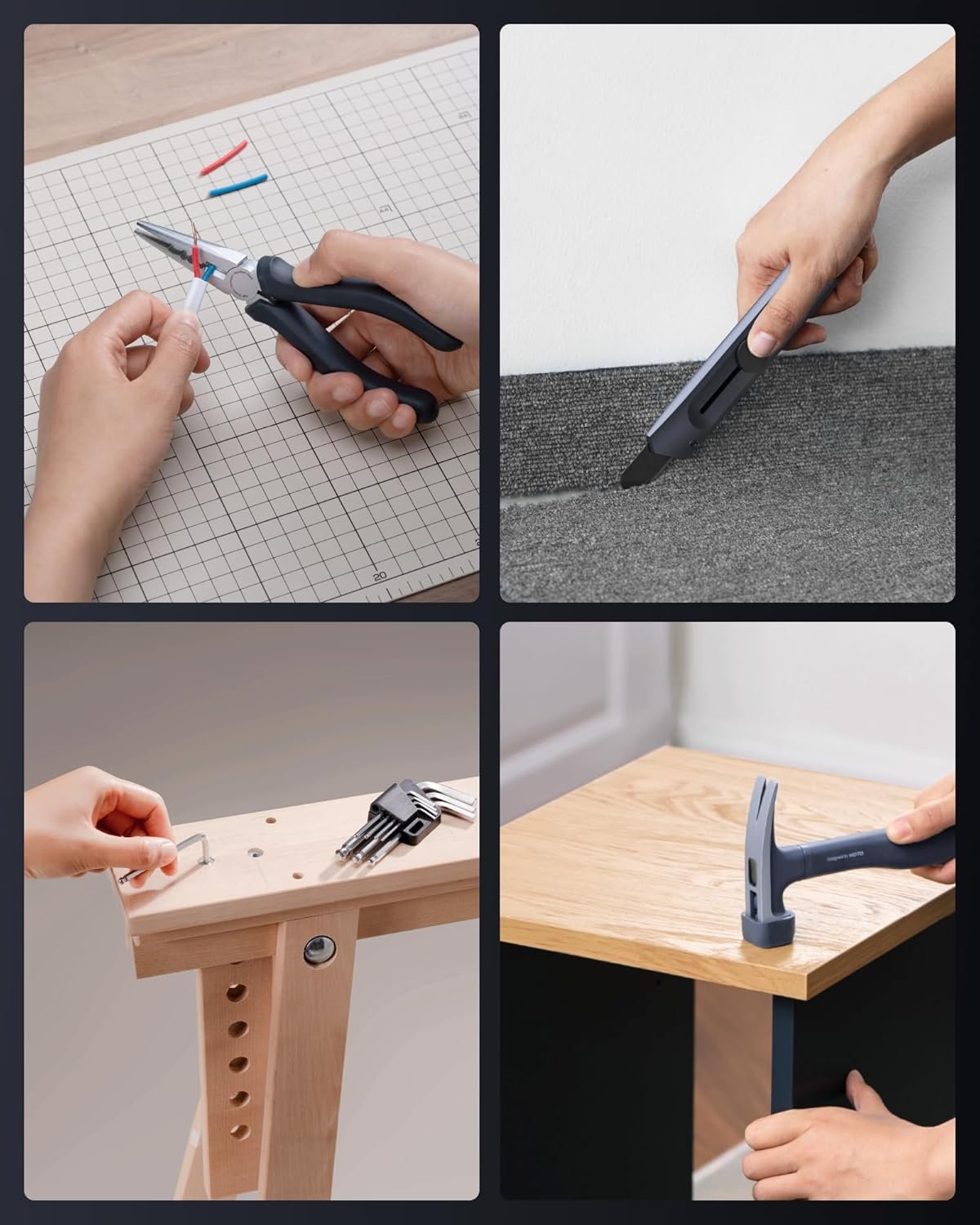 The HOTO 40-Piece Smart Tool Kit is the ultimate all-in-one solution for home repairs, DIY projects, and everyday fixes. Featuring a powerful smart electric screwdriver with three torque settings, LED ring light, and long-lasting rechargeable battery, it delivers precision and convenience for any task. The set also includes 14 high-quality tools such as a claw hammer with rubber cap, adjustable wrench, utility knife, tape measure, hex keys, pliers, and more. With 22 durable S2 steel screwdriver bits, a flexible shaft, and an extension rod, this kit is designed to handle hard-to-reach spaces with ease. All components are neatly organized in a compact, durable storage case with custom slots, making it lightweight, portable, and perfect for home, workshop, or on-the-go use. Built to last and designed for efficiency, the HOTO tool kit is an essential companion for homeowners, DIY enthusiasts, and anyone who values reliable tools in one smart package.